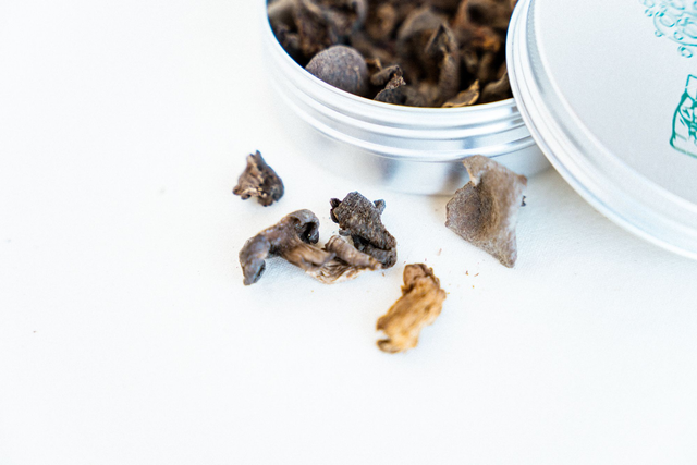 Gedroogde Lactarius Kabansus, een wilde eetbare paddenstoel, geplukt in Zambiaanse miombobossen door de buurvrouwen van de Minamba Research Farm, die hen helpt met het verpakken en labelen voor export, en ze een goede prijs geeft voor duurzaam geoogste paddenstoelen die hun familie zelf dit jaar niet op gaat eten.